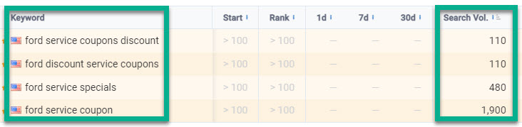 These are good examples of keywords that Ford dealerships can use to promote their service coupon specials pages across their website.Ā