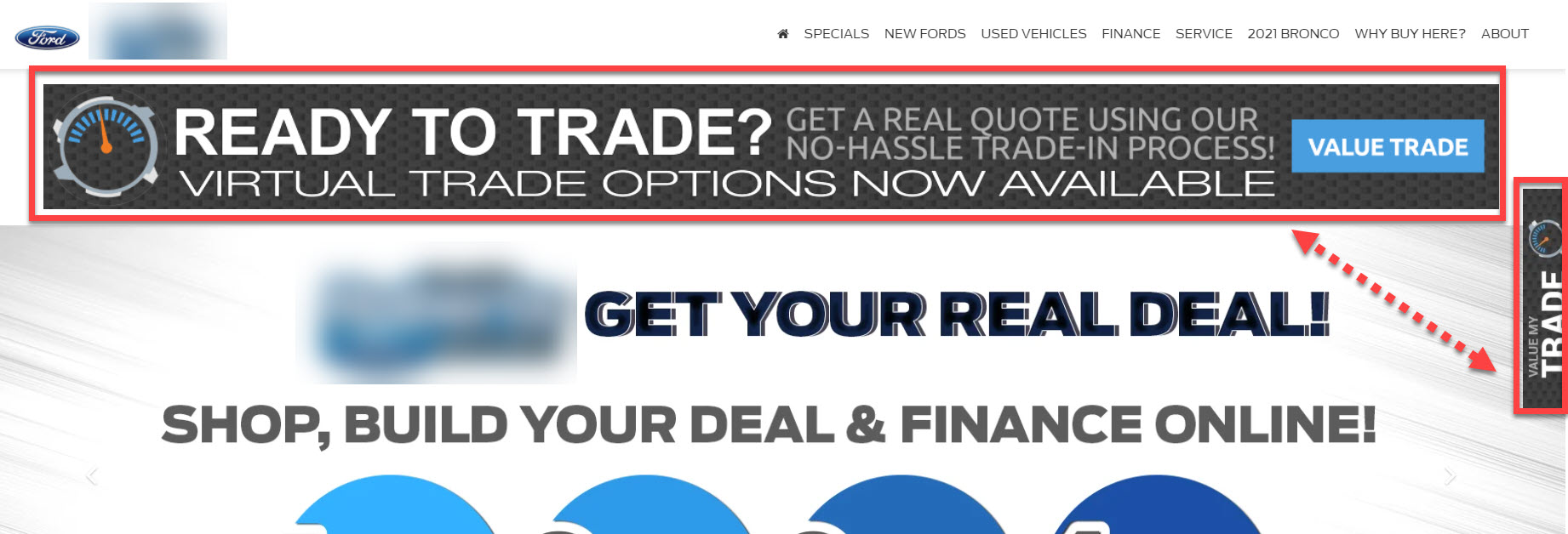 Don’t just add your trade-in page to your website navigation menu and stop. Dealer Teamwork recommends that dealers go a step further by adding website banners to their websites Use the premium real estate at the top of your pages to maximize visibility and engagement.