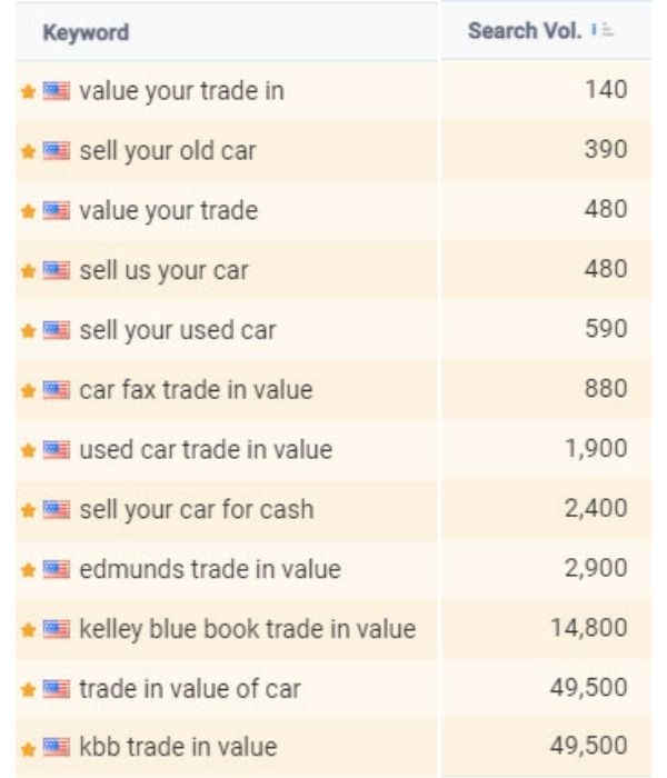 Remember that the keyword choice will depend on what type of car trade-in value tool a dealership uses. For example, if a dealer’s website uses Edmunds or Carfax to determine car trade-in value, don’t use “kbb trade-in value”.