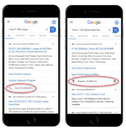 For example, note the two images below. The ad on the left provides a click-to-call extension for vehicle shoppers looking to call the dealership from the ad directly.