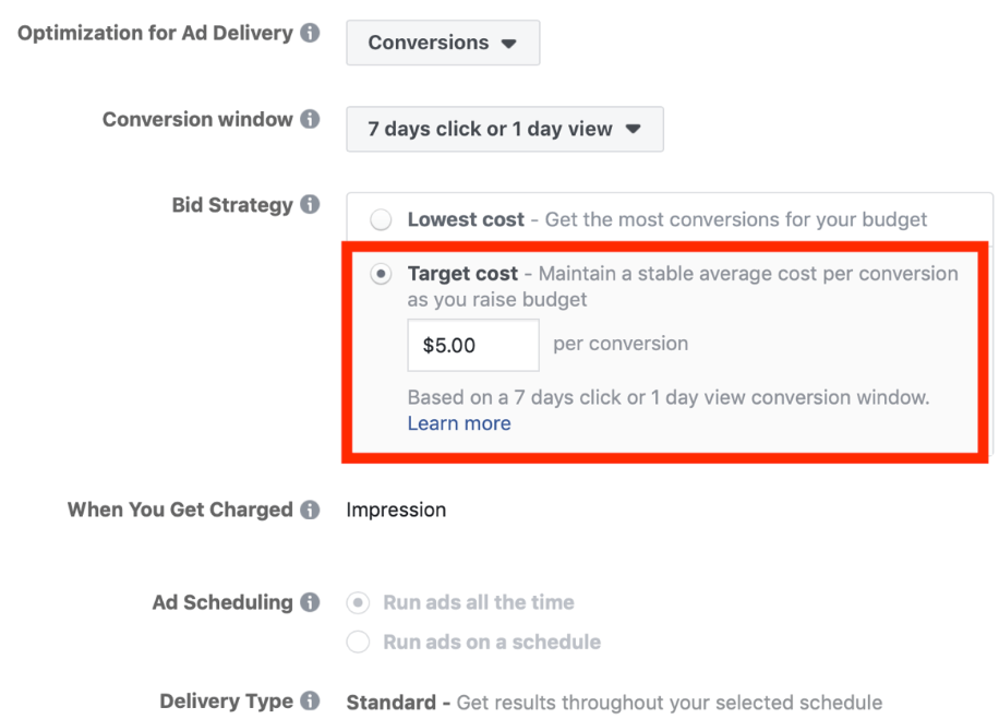 2. Ensure Facebook ad delivery strategy is set for conversions