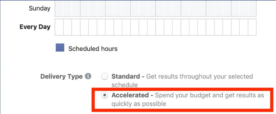 PRO TIP: Instead of choosing Standard for Delivery Type, choose Accelerated. This option shows ads faster during peak hours, which means you’ll display ads to MORE people when they’re online. Be careful though and WATCH YOUR BUDGET! Choosing this setting can result in ad budgets being spent quicker. I recommend experimenting with this once you’re confident with your ad and audience settings
