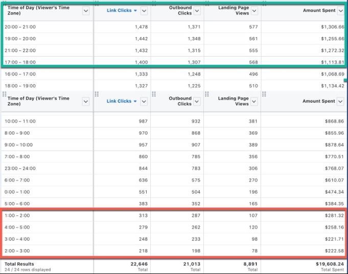 Discover the best performance times by comparing clicks, costs, conversions, and leads. You’ll notice in the example below that we circled in green the best times THIS account would want to display ads. Compare these times with those circled in red. See the difference?