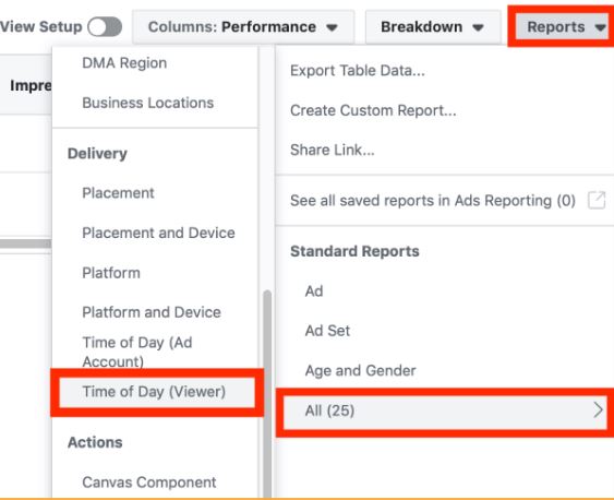 After you’ve chosen your start and end dates, find the best times to run ads. Do this from the Facebook Ads dashboard > Reports > Select All > Time of Day (Viewer).