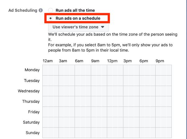 From there, you’ll want to set the start and end dates of your campaign. This is found by going to Ad Scheduling > Run Ads on a Schedule > Pick Days/Times.